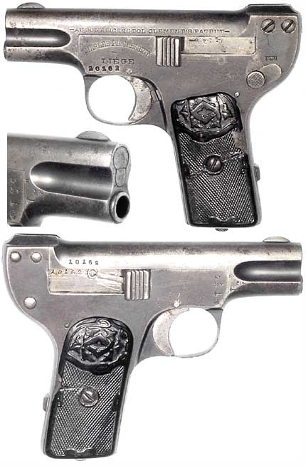 BELGIAN Model 1907 Clement semiautomatic pistol #10162 (.25 ACP), mfg. at Charles Ph. Clement in c.1909. Very Good condition with about 60% browned original finish. All-matching numbers, heavily-eroded bore with only traces of visible rifling but totally functional. Black-plastic grips chipped and repaired. Not import-marked, quite scarce with an unusual action (note magazine-release at back of grip). PHOTO . . . $195. C&R