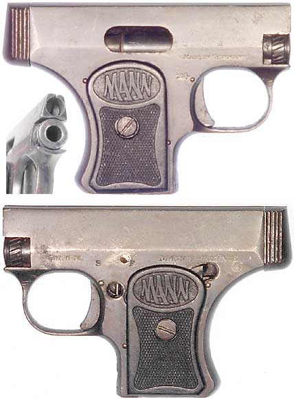 GERMAN Model VP semiautomatic pistol #11538 (.25 ACP), mfg. at Fritz Mann Werkzeugfabrik, Suhl in 1921. Very Good condition with about 80% original bluing, bore is quite eroded but rifling is present. All matching-numbers, strong markings, with nice black plastic MANN-logo checkered grips. Safety-lever has been lost, but it will function without it. One of the smallest vest-pocket pistols ever made with a very unusual action. Not import-marked, PHOTO . . . $125. C&R SOLD
