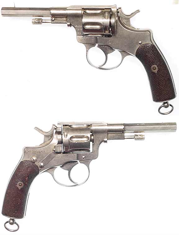 SWEDISH Model 1887 Nagant revolver #1312 (7.5 Swedish Nagant) mfg. by Husqvarna in c.1899. Very Good Plus condition with excellent mirror-bore and all-matching numbers. Nickel-plated, likely by a Swedish officer long-ago. Unit-marked L № 10364 on right side of frame. Lovely checkered walnut grips, minor holster-wear and some oxidation of finish over the last Century. Totally functional, not import-marked. PHOTO . . . $225. C&R