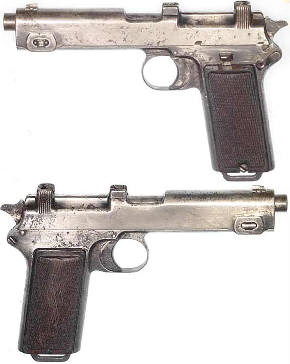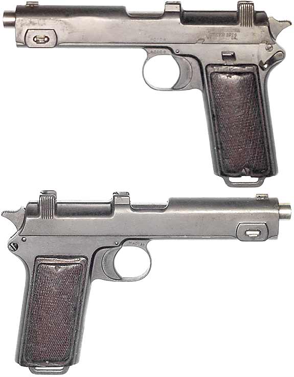 ROMANIAN Model 1912 Steyr-Hahn semiautomatic pistol (9mm Steyr) #4080e mfg. by Steyr in 1914. All-matching numbers, a reworked Romanian-contract pistol with the crest ground-off the left side of the slide. 100% external bluing with lightly frosted but strong and bright bore. Trigger is typically a bit stiff, but pistol is completely functional. PHOTOS . . . $225. C&R