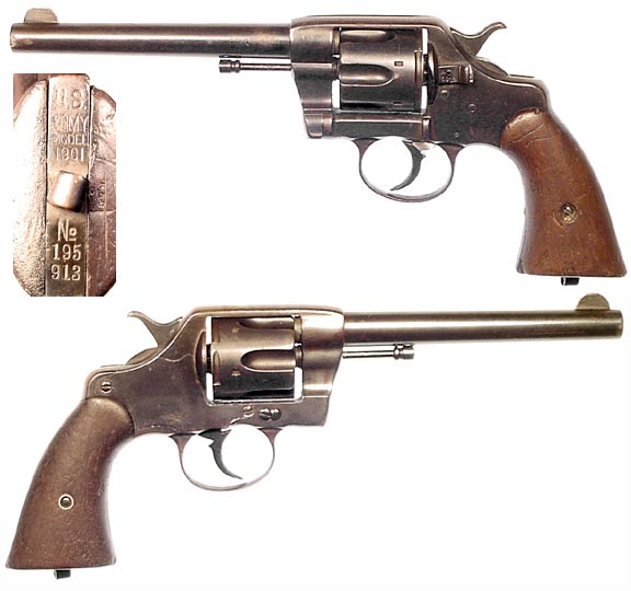 U.S.A. Model 1901 revolver #195913 (.38 Colt) with 6½" barrel, mfg. by Colt in1903. Very Good condition with 90% or better reblued metal (turning plum on top-strap) and a rough, somewhat pitted bore with strong lands & grooves. Butt marked US ARMY MODEL 1901 № 195913, initials R.A.C stamped on bottom of right grip. All-matching numbers, plain walnut grips, completely functional, missing lanyard-loop. Not import-marked. PHOTOS . . . $325. C&R SOLD