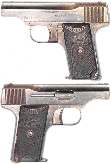 SPANISH "Martian" semiautomatic pistol # 3102 (.25 ACP), mfg. by Martin Bascaran, Eibar in 1934. Very Good condition, with 80% fading bluing and really bright strong bore. These pistols were very well-made with a pop-up front-sight (indicating whether or not the chamber was loaded) and a unique method of takedown by pulling down the rear of the triggerguard. Markings consist of AUTOMATIC PISTOL "MARTIAN" / CAL 7.65mm on left side of the slide, with serial # rendered as B.O.P.E. 3102, black checkered bakelite grips (the right one chipped) embossed with MARTIAN. Magazine lacks innards, else functional. No import-marks, scarce. PHOTO . . . $225. C&R