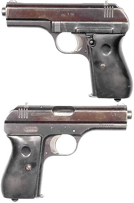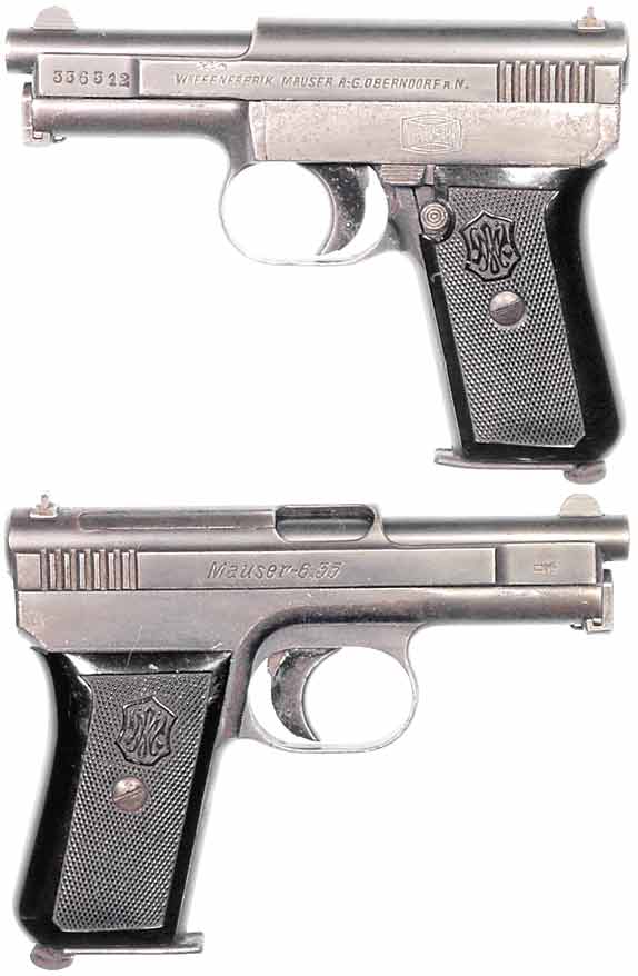 GERMAN Model 1910 Mauser semiautomatic pistol #336312 (.25 ACP) mfg. at Mauser in c.1919 . Very Good PLUS condition, with 95% bluing, some wear on sideplate. Bore is strong and quite bright with a light frost. Black bakelite WM-logo grips. Not import-marked. PHOTOS . . . $225. C&R SOLD