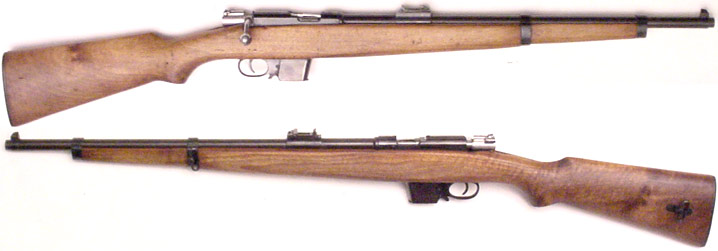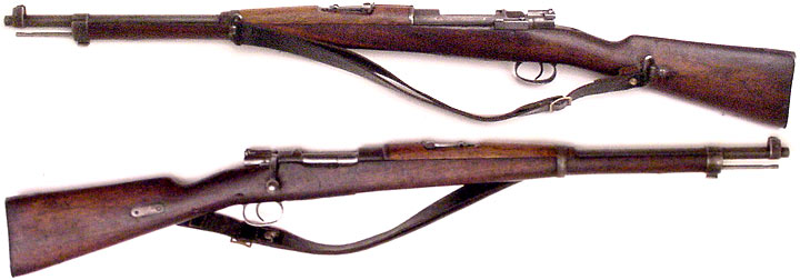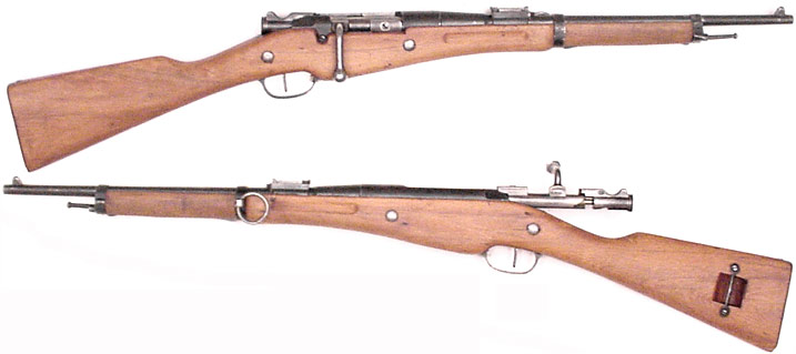 CHILEAN Model 1895 Mauser bolt-action cavalry short-rifle #B2725 (7x57) mfg. by Loewe in 1895. Very Good condition, with 60% thinning bluing mostly turned to plum. Strong Chilean crest above chamber. No matching numbers, bolt (#B2031) is of the correct type and headspaces properly. Strong bore with dark grooves. Original walnut stock and matching handguard has numerous handling-marks and side-swivels with original leather sling. Includes cleaning-rod. PHOTOS . . . $225. Antique, no FFL required SOLD