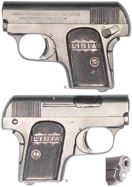 SPANISH "Libia" semiautomatic vest-pocket pistol # 39879 (.25 ACP), a copy of the Browning/FN pistol mfg. by Fabrique d'Armes de Guerre de Grande Precision in the early 1920's. Very Good condition, with 100% Parkerized re-finish. These pistols were very well-made with a grip-safety as well as a manual one. Bore is quite eroded but rifling is distinct. Not import-marked. PHOTO . . . $165. C&R SOLD