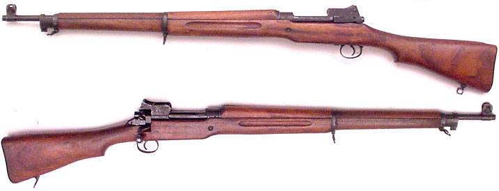 U.S.A. Model of 1917 "Enfield" bolt-action rifle #542373 (.30-06) mfg. by Remington in 1918 with R / 9-18 marked barrel. A reworked example in Excellent condition with 95% or better phosphate external finish and mirror-bright sharp bore. Most parts all marked with E. Has ordnance-bombs on receiver and bolt-handle. Wood has some minor handling-marks but apparently retains its original finish and is stamped A A F one left side with RIA / EK within square (Rock Island Arsenal) as well. PHOTOS . . . $425. C&R SOLD