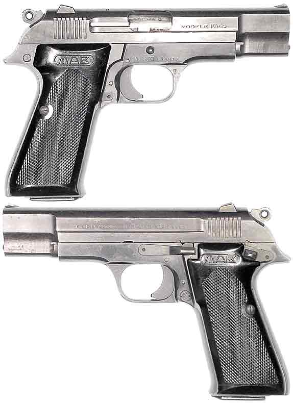 FRENCH Model PA-15 MAB semiautomatic pistol #556014 (9mm), mfg. at Bayonne in the 1970's. Excellent condition with about 96% original bluing with a plum-hued slide. The bore is excellent and very shiny. All matching-numbers, black-plastic grips, with 15-round magazine. Not import-marked, these monster handguns are currently used by the FINN border guards and have never been very numerous in the U.S. FINN border guards and have never been very numerous in the U.S. PHOTO . . . $525. not C&R