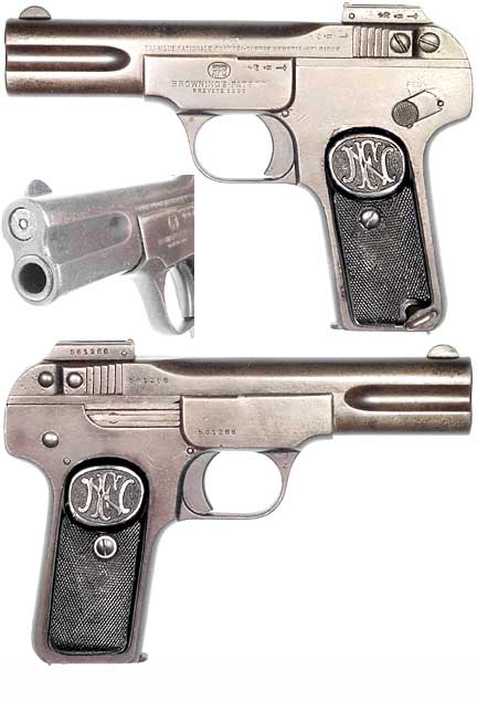 BELGIAN Model 1900 Browning semiautomatic pistol #561266 (.32 ACP), mfg. at Fabrique National in 1909. Very Good condition with about 60% browned original finish. All-matching numbers, strong mostly-bright bore and totally functional. Not import-marked, PHOTO . . . $225. C&R SOLD