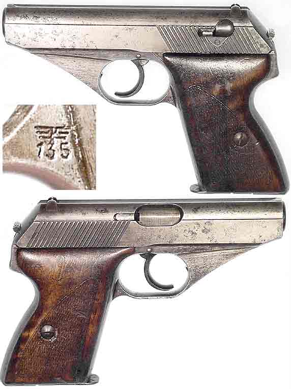 GERMAN Model HSc Mauser semiautomatic pistol #817031 (.32 ACP) mfg. at Mauser in c.1944. Good condition, completely functional but with little original finish (appears to be blood-pitting), bore is strong and quite bright with a light frost. Nazi-markings bold, magazine-floorplate numbered 056. Walnut checkered grips have some attractive "tigerstripe" figure in them. MAUSER banner and all slide markings are legible but not crisp. Not import-marked. PHOTOS . . . $225. C&R SOLD