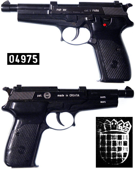 CROATIAN Model PHP MV semiautomatic pistol # 04975 (.32 ACP). Excellent condition with 95% or better blued finish and Croatian crest above chamber. A unique native design, similar to a high-capacity P38. Bore is mirror-bright, markings are very sharp, and black plastic grips are not chipped. Includes one 15-round PHP-marked magazine. PHOTOS . . . $295. not C&R SOLD