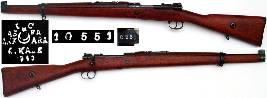 TURKISH Model 1905 Mauser bolt-action carbine # 10551 (8mm) reconfigured by K. Kale in 1940. Excellent condition, a large-ring standard-length Mauser action with 95% or better original bluing on the metal surfaces with little apparent wear and a sharp mirror-bore and all matching numbers (including the bent bolt). Stocked to the muzzle the wood looks to having been nicely refinished and stained with a small arsenal repair at tang. Not import-marked, rare. PHOTOS . . . $425. C&R SOLD