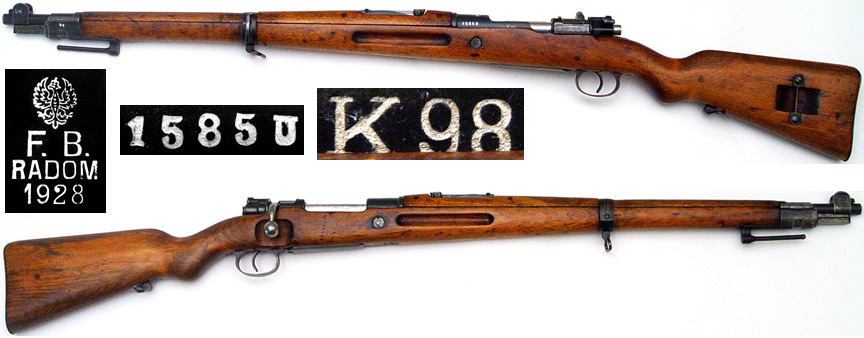 POLISH Model K98 Mauser bolt-action rifle # 1585U (8x57) mfg. by Radom in 1928. Basically a small-ring Karbiner 98 with stacking-hook and no provision for cleaning-rod. Rifle is in Very Good condition with nice strong and bright bore. Great Polish Eagle crest atop chamber, barreled receiver and barrel-bands all matching including triggerguard, bolt parts all have different numbers (but it is the correct Polish bolt, with checkered and flattened bolt-knob and Polish eagle stamped on bottom of handle. Stock has some handling marks but is sound and quite attractive. Not import-marked, very scarce indeed. PHOTO . . . $875. C&R SOLD