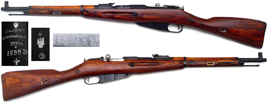 RUSSIAN Model 91/38 Mosin-Nagant bolt-action carbine # 169038 (7.62x54R) mfg. by Izhevsk in 1915. Excellent condition with 90% or better bluing with all matching numbers (bolt-body weakly electropenciled to match). Bore is quite bright (and has NOT been counterbored at muzzle). Lovely laminated stock has a few minor handling marks from storage. Includes cleaning rod. PHOTOS . . . $275. C&R SOLD