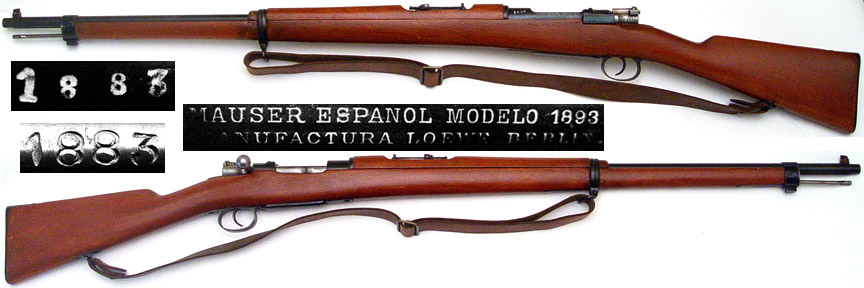 SPANISH Model 1893 Mauser bolt-action rifle # 1883 (7x57), mfg. by Ludwig Loewe in 1896. Near Excellent condition, with 90% or better bluing on all metal parts. Bolt handle numbered 1883 to match, no other numbers matching anything. Crest above chamber has been scrubbed and someone's Social Security number has been very lightly scratched in its place. Bore is mostly bright and strong, stock looks to have been refinished. Includes cleaning rod and what looks to be original leather sling. Not import-marked. PHOTOS . . . $375. Antique, no FFL required SOLD