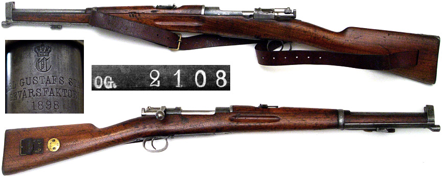 SWEDISH Model 94/14 Mauser bolt-action carbine # 2108 (6.5x55) by Carl Gustaf in 1898. Good condition with very little external bluing remaining. Bore is mostly bright with a some crud in the grooves. All parts except magazine floorplate numbered 108. Retains its sling as well as brass unit-disk. Not import-marked, completely functional and unaltered. PHOTOS . . . $825. Antique, no FFL required SOLD