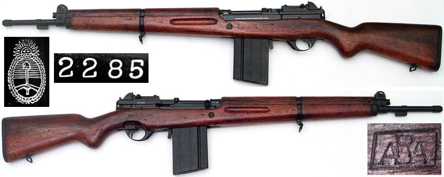 ARGENTINE Model FN-49 Saive semiautomatic rifle # 2285 (rechambered in 7.62 NATO) mfg. by Fabrique Nationale in c.1953. Excellent-PLUS condition, with full original painted finish (stoving) remaining and mirror-perfect bore. All-matching numbers, Argentinean crest on receiver is bold and strong. Nicely figured walnut stock has original finish with a few handling-marks and dings from adjacent rifles. Includes one detachable 20-round magazine and brown leather sling. PHOTOS . . . $1250. C&R (not for sale in California or wherever hi-cap magazines have been outlawed) SOLD