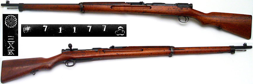 JAPANESE Type 38 Arisaka bolt-action rifle Series 25, # 71177 (6.5x50) mfg. at Kokura in c.1940. Very Good condition with most original bluing remaining, some scattered crusty patina and some pitting at wood line. Has intact mum, all parts are numbered 177. This type has ladder v-type rear sight and includes cleaning rod but no sliding action-cover. Bore is mostly bright and very strong, wood has original finish with many stamps as well as dings, scrapes, gouges and other contact-marks from actual service use. Not import-marked. PHOTO . . . $450. C&R SOLD