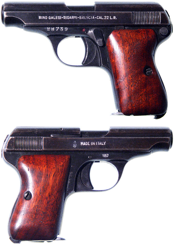 ITALIAN Modelo 54 semiautomatic pistol # 28739 (.22 Long Rifle) mfg. at Rigarmi Rino Galesi in 1957. A cute vest-pocket pistol in Very Good condition with most blued finish remaining (worn only on edges and corners). Bore is mirror-bright and very strong, pistol is completely functional. Not import-marked. PHOTO . . . $225. C&R SOLD
