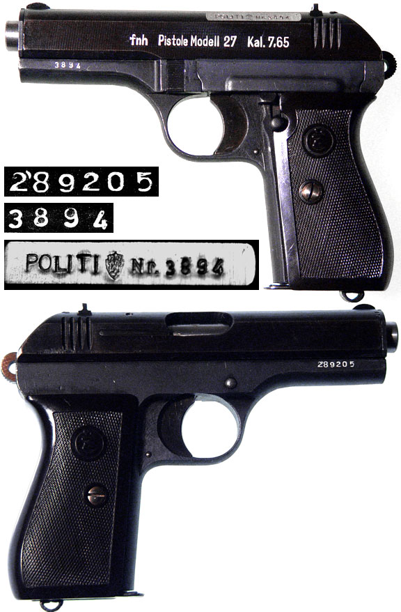 NORWEGIAN Model CZ-27 semiautomatic pistol # 289205 (.32 ACP), mfg. at "Bohemian Arms Factory" in early 1944 under Nazi occupation. Excellent condition, with at least 98% original bluing and a high-polish finish, all markings and Waffenampts sharp and clear, mostly intact "straw" on unblued parts. All matching numbers with near-perfect mirror-bright bore. Ex Norwegian Police, with a flat ground in the left side of the slide stamped POLITI with Norwegian crest and property No.3894 (same number stamped on left side of frame). Bakelite grips uncracked and intact, as nice an example of a CZ-27 I believe I have ever seen. PHOTO. . . $725. C&R