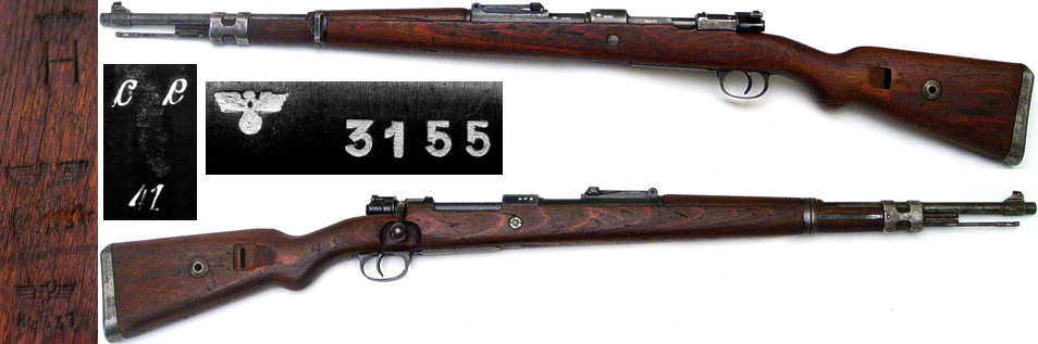 GERMAN Model 98k Mauser bolt-action rifle # 3155 (8x57) mfg. by Sauer & Son (code ce) in 1941. Good to Very Good condition. All-matching numbers and 100% original and correct. Not much remaining bluing on external metal but bore is nicer than could be expected. All Nazi stamps on metal intact. Includes cleaning-rod but no front sight-hood. Not import marked. PHOTO . . . $975. C&R SOLD