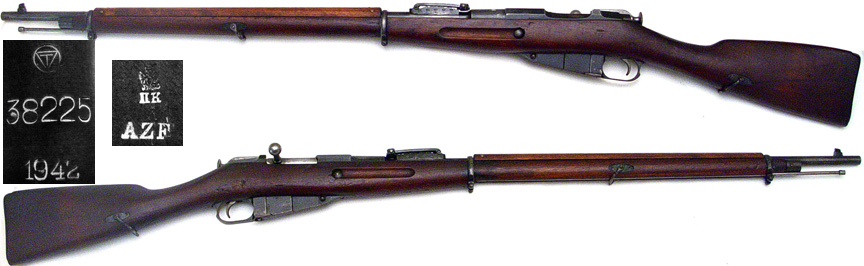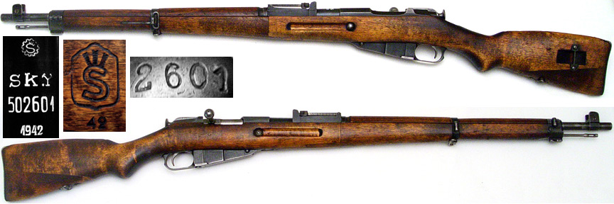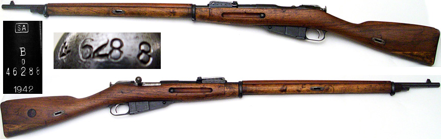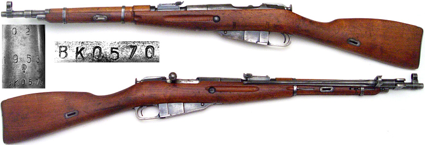 FINN Model 39 Mosin-Nagant bolt-action rifle # 502601 (7.62x54R) mfg. by SAKO in 1942 with SK.Y marked barrel on an 1896-dated Tula receiver. Very Good condition with 70% faded bluing on all metal parts and a mirror bright very strong bore (NOT counterbored at muzzle). Matching bolt-knob, numbers on magazine floorplate and buttplate not matching (as usual). Includes cleaning-rod. Stock has some handling marks from actual service use but has original finish with bold 1942-dated Civil-Guard cartouche on right side, Includes cleaning rod. PHOTOS . . . $475. Antique, no FFL required SOLD
