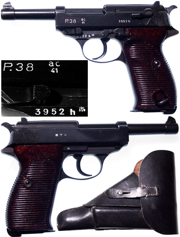 GERMAN Model P-38 Walther semiautomatic pistol # 3952h (9mm Parabellum) mfg. at Walther (Nazi code ac 41) in October 1941. Excellent condition, with over 95% bluing with strong and mirror-bright bore. All-matching numbers, strong markings, includes two unnumbered eight-round E/359 marked magazines and soft-shell holster in Excellent condition. Not import-marked and totally correct. PHOTOS . . . $975. C&R SOLD