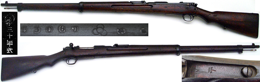 JAPANESE Type 30 Arisaka bolt-action rifle # 53060 (6.5x50) mfg. at Koishikawa in c.1900. Very Good condition with much original bluing remaining, that on the triggerguard and magazine floorplate badly faded from actual use. Mum has been heavily pinged. This type has hook-type safety, ladder v-type rear sight and includes cleaning rod. Bore is mostly bright and very strong, wood is sound but upper metal tang is mysteriously missing. Not import-marked. PHOTO . . . $325. C&R SOLD