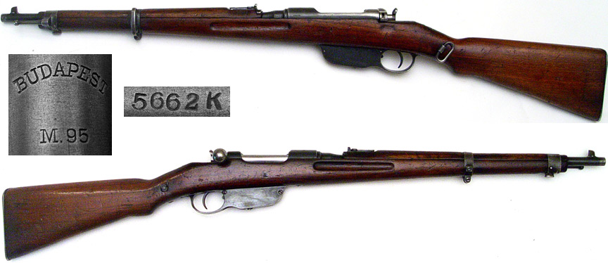 HUNGARIAN Model 1895 straight-pull Mannlicher carbine # 5662K (8x56R) mfg. by F.E.G. Budapest in 1917. Very Good condition, some bluing remaining on external metal. All-matching numbers, bore is very rough from lack of proper cleaning. Totally functional. PHOTOS . . . $110. C&R SOLD