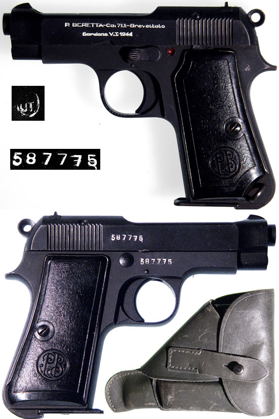 Nazi-occupied ITALY Model 1935 semiautomatic pistol # 587775 (.32 ACP) mfg. by Beretta in 1944. Excellent condition with 95% dull phosphate finish. 4 / UT Nazi proof on left side of frame. Bore is sharp and bright. Includes one flat-bottomed 7-round magazine and apple-green leather holster in Very Good condition. Not import-marked. PHOTOS . . . $525. C&R