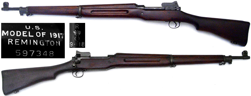 U.S.A. Model of 1917 bolt-action infantry rifle # 597348 (.30-06) mfg. by Remington in September, 1918. Very Good condition with 60% or better blued finish on metal and a mostly bright and strong bore. Stock has been lightly sanded with rectangular 3GM-K cartouche on left side. Not import-marked. PHOTOS . . . $600. C&R SOLD
