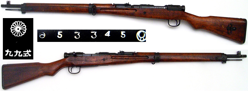 JAPANESE Type 99 Arisaka bolt-action rifle Series 6 # 53345 (7.7x58) mfg. at Nagoya in c.1943. Very Good condition with faded original bluing, cylindrical bolt and most bolt parts numbered 614, Has intact mum and original cleaning rod. Excellent bore, no import-marks, functional. PHOTO . . . $425. C&R SOLD