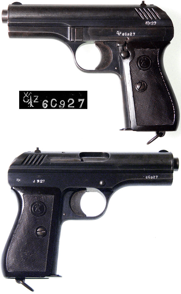 CZECH Model CZ24 semiautomatic pistol # 60927 (.380 ACP) mfg. at Ceska Zbrojovka, Prague in 1927. Near Excellent condition with 85% or so original bluing with the slightest trace of holster wear. Bore is excellent and mirror-bright, markings are very sharp with unit marking 2HN 16L on front strap. Bakelite grips are slightly chipped on bottom-right corner. Not import-marked, a really handsome example. PHOTOS . . . $425. C&R