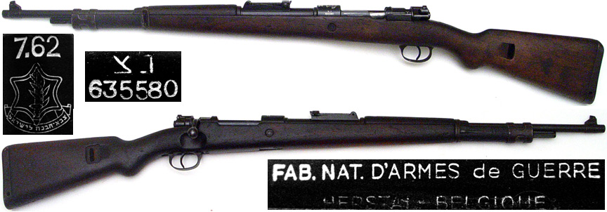 ISRAELI Model 98k Mauser bolt-action rifle # 635580 (7.62x51 NATO) mfg. by Fabrique National in the mid-1950's. Near Excellent condition, with 90% bluing and usual mismatched bolt (however it is a proper FN 98k bolt). Top of receiver stamped with massive Star of David IDF logo. Bore is bright and extremely strong, some external light pitting at the wood line. Wood is beech with a dull finish and a few handling marks and a large 7.62 stamped in bottom but is sound with no cracks. No front sight hood or cleaning-rod (stock is not even routed for one). PHOTOS . . . $395. C&R SOLD