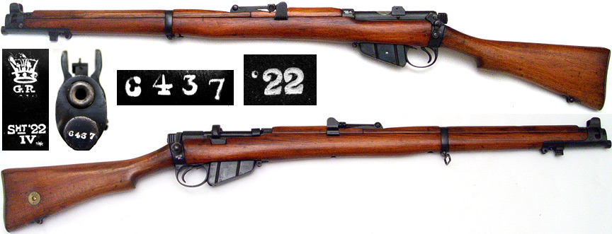 BRITISH Enfield Mk.IV* bolt-action training rifle # 6437 (.22 Long Rifle) mfg. by Enfield in 1918 and converted to .22 in 1935. Excellent condition, with most remaining oil-blacked finish and a rather bright bore. Has all-matching numbers and windage-adjustable rear sight. Wood has lovely finish with brass unit-disk on right side. Not import-marked. PHOTOS . . . $475. C&R SOLD
