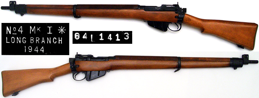 CANADIAN Enfield No.4 Mk.I* bolt-action rifle # 64L1413 (.303 British) mfg. by Long Branch arsenal in 1944. Excellent-PLUS, looks new but is a rework of some kind with 1949-dated Fazakerly wood, an unnumbered 1953-dated Fazakerly bolt, and stamped Mk.III ladder rear sight. Bore is mirror-bright and gorgeous 2-groove type, bolt-head stamped with #2. Quite attractive. PHOTOS . . . $425. C&R SOLD