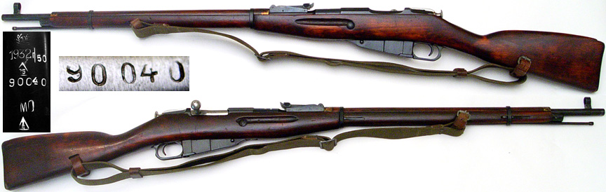RUSSIAN Model 91/30 Mosin-Nagant bolt-action rifle # 90040 (7.62x54R) mfg. by Tula in 1932 and re-issued to the Soviet Ministry of Defense in 1950. Excellent arsenal-refurbished condition with 95% or better bluing on all metal parts. All-matching STAMPED numbers, dated 1932/50 with MO markings atop barrel-shank. Bore is mirror-bright (has been counterbored at muzzle). Buttstock has a few minor scuffs with sling and cleaning-rod. PHOTOS . . . $225. C&R