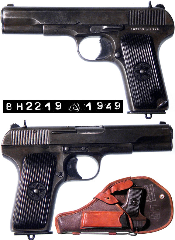 RUSSIAN Model TT-33 Tokarev semiautomatic pistol # BH2219 (7.62x25), mfg. by Izhevsk in 1949. Very Good condition, with 60% external bluing, bore is mirror-bright with strong rifling. All matching serial numbers except magazines. Does not have added-on safety lever, grips are intact with the CCCP around star motif. Includes 1955-dated Russian leatherette holster, with cleaning-rod. Not import-marked. PHOTOS . . . $725. C&R