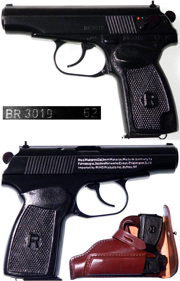 EAST GERMAN Model 59 Makarov semiautomatic pistol # BR3019 (9x18 Makarov) mfg. by Ernst Thaelmann, Suhl in 1962. Excellent condition, very little holster-wear or marks on slide. Gorgeous mirror-bright bore and unbelievably smooth functioning. Includes one 8-round magazine and non-standard black plastic RUKO grips (required for importation but easily replaces with the proper EG grips) as well as two magazines and an excellent-PLUS brown leather holster. PHOTOS . . . $375. C&R SOLD