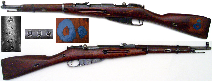 RUSSIAN Model 38 Mosin-Nagant bolt-action carbine # CI994 (7.62x54R) mfg. by Izhevsk in 1940. Good to Very Good condition with most bluing worn but with all matching STAMPED numbers (letter prefixes on barrel only). Bore is mirror-bright (and has NOT been counterbored at muzzle). M44 stock (with groove on right side for bayonet) has quite a few handling marks and blue Arabic number 50 painted on left side (usually a sign of Egyptian usage). Includes cleaning rod. PHOTOS . . . $275. C&R SOLD