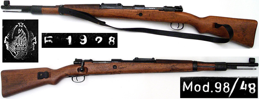 YUGOSLAVIAN Model 98/48 Mauser bolt-action rifle # F1928 (8x57), a reworked German 98k rifle, reblued with all Nazi markings removed and Yugoslav crest above chamber. Excellent condition, with 95% or better bluing, excellent mirror-bore (has a considerable amount of very sticky cosmoline throughout). Includes cleaning-rod, front sight hood, and leather sling. PHOTO . . . $275. C&R SOLD