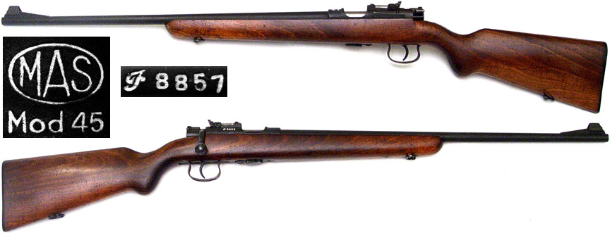 FRENCH Model 45 MAS bolt-action training rifle # F8857 (.22 Long Rifle) manufactured at St. Etienne in c.1946. Excellent condition, with all Parkerizing intact. Includes one five-round magazine. PHOTOS . . . $350. C&R SOLD