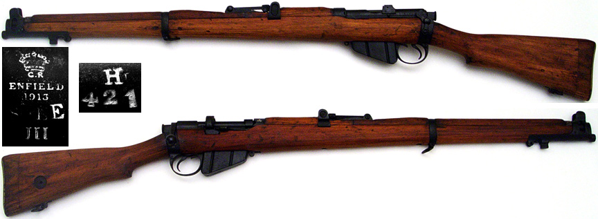 BRITISH Enfield No.1 Mk.III bolt-action rifle # H421 (.303 British) mfg. by Enfield in 1913. Near Excellent condition, with most remaining oil-blacked finish and a rather bright 4-groove bore. Has all-matching numbers and intact magazine cut-off. Wood has no finish and appears to have been pressure-cleaned, with around a 1" dovetailed repair at butt, hole for unit-disk on right side. PHOTOS . . . $350. C&R SOLD
