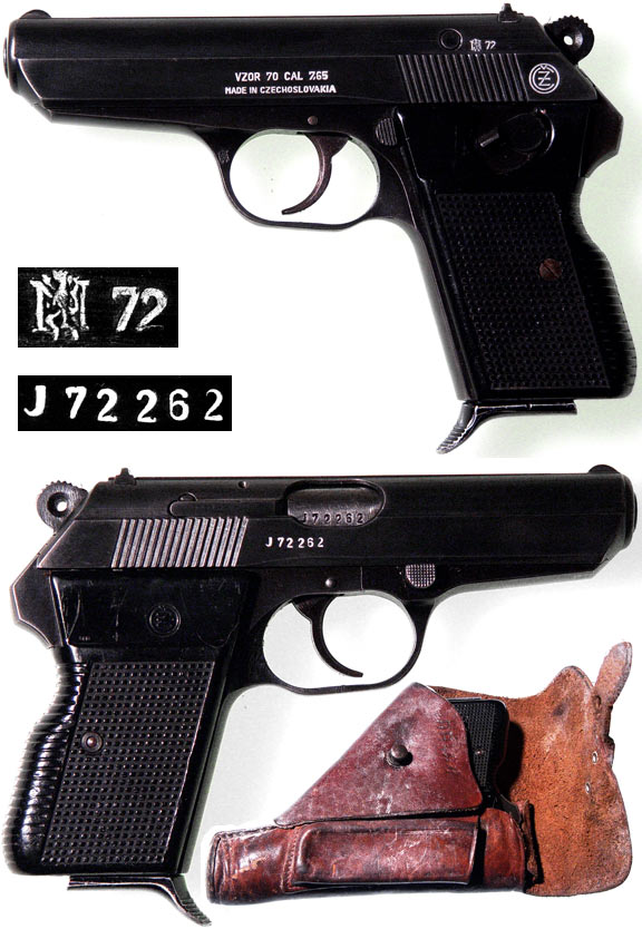 CZECH Model CZ70 semiautomatic pistol # J72262 (.32 ACP) mfg. at Ceska Zbrojovka, Strakonice in 1972. Excellent condition with 95% or better blued finish. Bore is mirror-bright, markings are very sharp, and black plastic grips are not chipped. Includes full-flap brown leather holster that is likely not for this model (but it fits). Not import-marked, and rare thus. PHOTOS . . . $325. not C&R