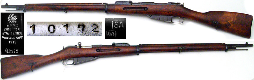 FINN Model 1891 Mosin Nagant bolt-action rifle # 10172 (7.62x54R) mfg. at Tula in 1915 with two [SA] property marks on left side of barrel-shank. Near Excellent condition, most bluing remaining with very strong markings. Bolt-body stamped 10172. Bore is bright with strong rifling, has been counterbored at muzzle. Finn two-piece stock has very few handling marks, includes cleaning rod. PHOTOS . . . $260. C&R SOLD