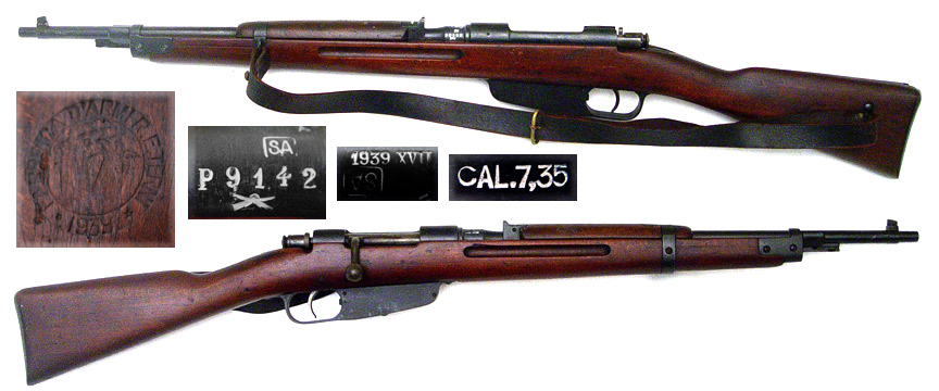 FINN Model 38 Mannlicher-Carcano bolt-action short rifle # P9142 (7.35x53) mfg. by Terni in 1939, [SA] Finnish property marks on left side and top of barrel-shank. Excellent condition, with 95% or better bluing, bore somewhat bright but a bit rough. Wood has very few handling marks, initials J.K. carved atop handguard by bored Finnish soldier, unusually clear and strong arsenal cartouche on left side. Includes original leather sling. Not import-marked. PHOTO . . . $325. C&R