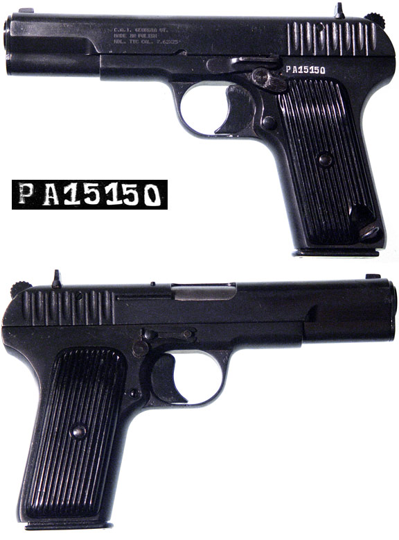 POLISH Model TTC Tokarev semiautomatic pistol # PA15150 (7.62x25), mfg. by Radom in 1952. Excellent condition, with 95% external bluing, bore is mirror-bright with strong rifling. All matching serial numbers except magazine. Does have added-on safety lever. PHOTOS . . . $275. C&R