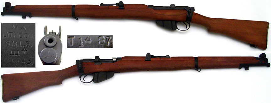 AUSTRALIAN No.1 Mk.III* bolt-action training rifle # T1487 (.22 Long Rifle conversion from .303 British) mfg. by Lithgow Arsenal in 1943. Excellent-PLUS condition with full oil-blacked finish and mirror-bright and strong bore. All matching numbers, buttstock and handguards are of lovely Australian coachwood with very few of the expected handling-marks and compressions. Magazine has no spring or follower. PHOTOS . . . $650. C&R SOLD