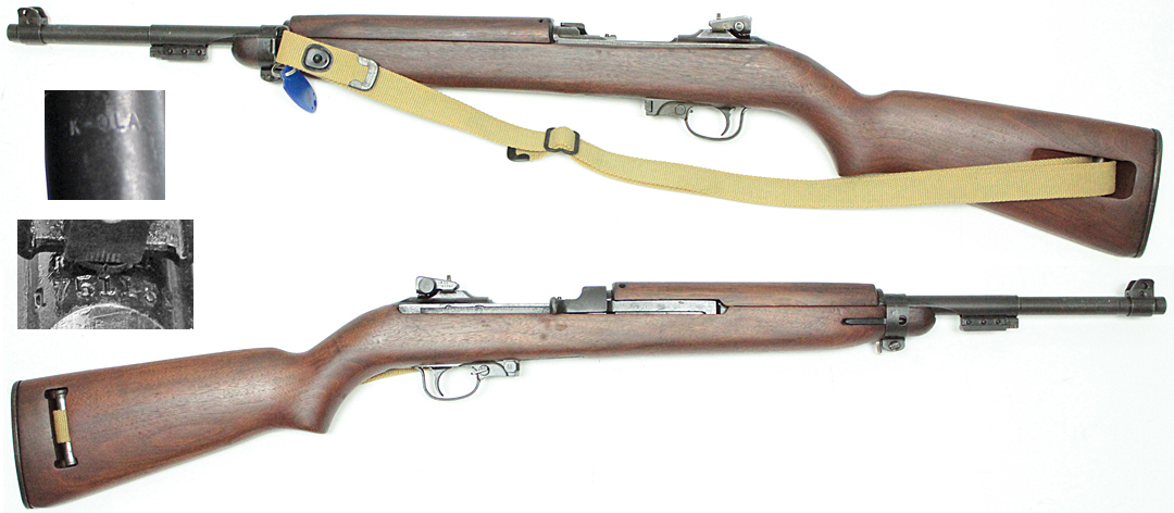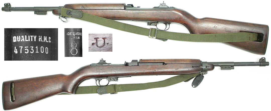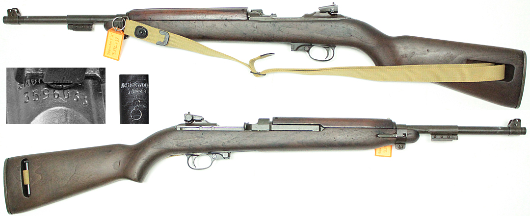 U.S.A. Model M1 Carbine semiautomatic rifle # 4753100 (.30 Carbine) mfg. by Quality Hardware in Late 1943 with 1-44 dated Underwood barrel. Excellent condition, metal has mostly full Parkerized finish with a mirror bright bore and with 2.5 muzzle-wear. This features a flat-topped bolt, flip lever safety, L-shaped flip rear sight and early front band without bayonet-lug. High-wood ·U· cartouched walnut stock and handguard has very few dings and handling marks. Includes one 15-round unmarked magazine (only where legal) with web sling and oiler. Not import-marked. PHOTOS . . . $1875. C&R SOLD