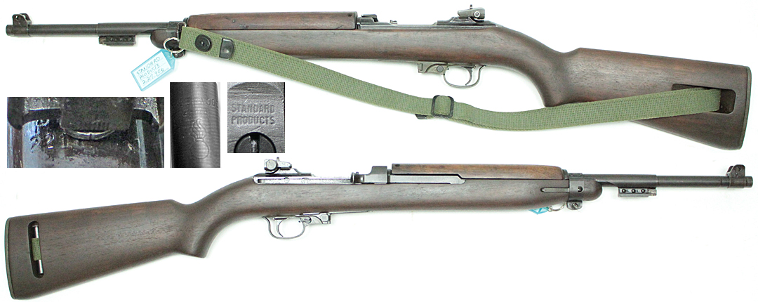 U.S.A. Model M1 Carbine semiautomatic rifle # 2217906 (.30 Carbine) mfg. by Standard Products in Spring 1944 with 2-44 dated Underwood barrel. Excellent condition, metal has mostly full Parkerized finish with a mirror bright bore and with 2.5 muzzle-wear. This features a flat-topped bolt, flip-type safety, M-marked magazine release, adjustable rear sight and late front band with bayonet-lug. High-wood walnut stock and handguard has very few (if any) handling marks. Includes one 30-round unmarked magazine (only where legal) with web sling and oiler. Not import-marked with CMP certificate of authenticity. PHOTOS . . . $1450. C&R SOLD