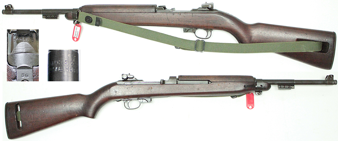 U.S.A. Model M1 Carbine semiautomatic rifle # 3596033 (.30 Carbine) mfg. by Saginaw S' G' in Fall 1944 with 11-43 dated Underwood barrel. Excellent condition, metal has mostly full Parkerized finish with a mirror bright bore and with 1.5 muzzle-wear. This features a flat-topped bolt, push-button safety, adjustable rear sight and late front band with bayonet-lug. High-wood walnut stock and handguard has quite a few dings and handling marks. Includes one 15-round unmarked magazine (only where legal) with web sling and oiler. Not import-marked with CMP certificate of authenticity. PHOTOS . . . $1625. C&R SOLD